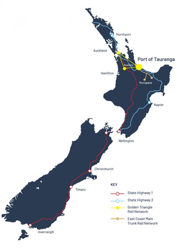 New Zealand’s importers and exporters are within easy reach of Port of Tauranga’s national network of ports, inland freight hubs and logistics services.